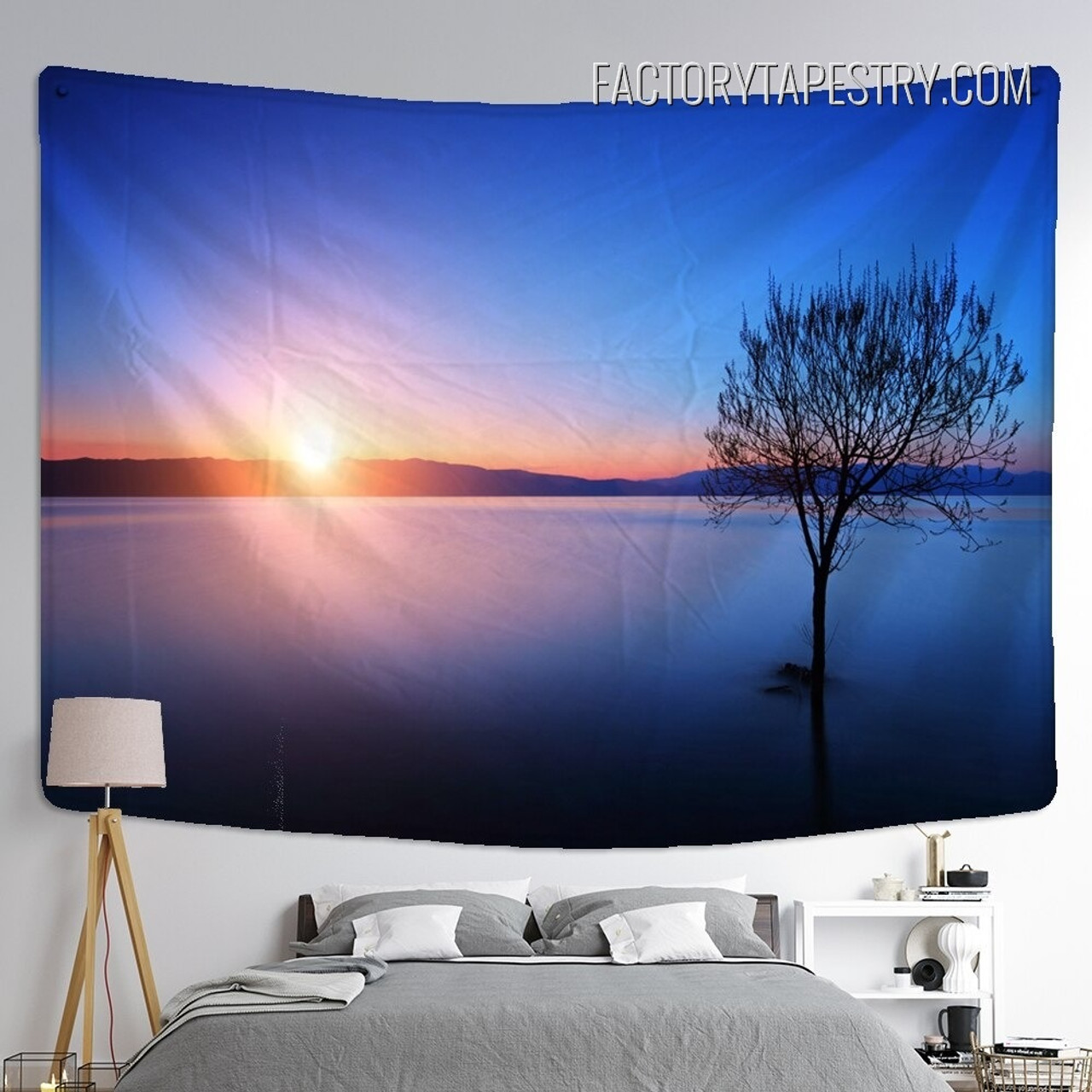 Bring the tranquility of nature indoors with this elegant tapestry featuring a view of Ohrid Lake at sunrise or sunset. The beautiful scenery captures the silhouette of a tree against a lovely, romantic sky. This modern wall hanging offers captivating nature art, transforming your space with its peaceful and serene beauty.